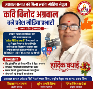 रतलाम जिले के जावरा निवासी विनोद अग्रवाल मध्यप्रदेश अग्रवाल समाज के लिए गर्व का क्षण उस समय आया जब अग्रवाल महासभा फाउंडेशन द्वारा समाज के सक्रिय और चर्चित व्यक्तित्व कवि विनोद अग्रवाल को “प्रदेश मीडिया प्रभारी” के महत्वपूर्ण पद की जिम्मेदारी सौंपी गई। यह नियुक्ति संस्था के राष्ट्रीय अध्यक्ष विद्यासागर अग्रवाल ने राष्ट्रीय महामंत्री सुरेश रामपीपलिया एवं दिनेश जिंदल (इंदौर) की अनुशंसा पर की।